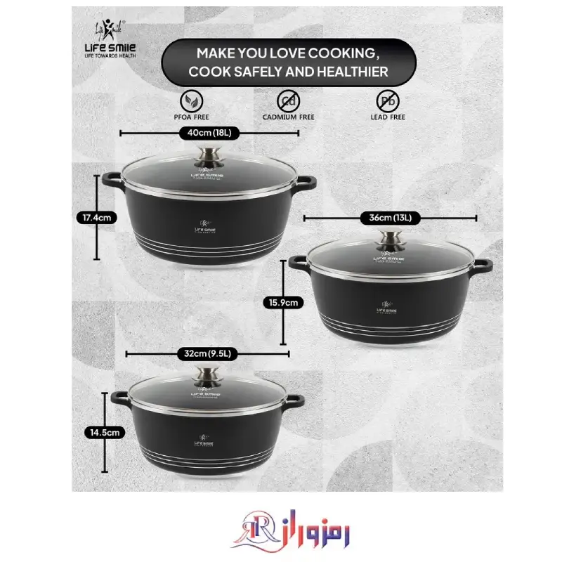 سرویس قابلمه سرامیکی لایف اسمایل اصلی مدل LUP6-3BB یکی از محصولات 6 پارچه ی برند لایف اسمایل است که دارای سه عدد قابلمه در اندازه های متفاوت 32،36 و 40 سانتی متر و ظرفیت 9.5 لیتر،13 لیتر و 18 لیتر و سه درب که هر کدام مخصوص یک قابلمه می باشد. جنس بدنه ی این سرویس قابلمه از آلومینیوم ریخته گری ساخته شده است که سبب می شود تا استحکام و دوام محصول در برابر ضربه و خراشیدگی بالاتر رود و قابلمه ها مقاومت بیشتری داشته باشند.بدنه ی سرامیکی سرویس قابلمه سرامیکی لایف اسمایل اصلی مدل LUP6-3BB سبب می شود تا حرارت و گرما به صورت یکنواخت در تمام سطح قابلمه پخش شود و مواد به صورت کامل و در یک زمان پخته شوند کف قابلمه القایی بوده و قابلیت شعله پخش کن دارد و برای هر نوع اجاقی از جمله گازی، برقی، هالوژنی، سرامیکی و فر نیز مناسب است.