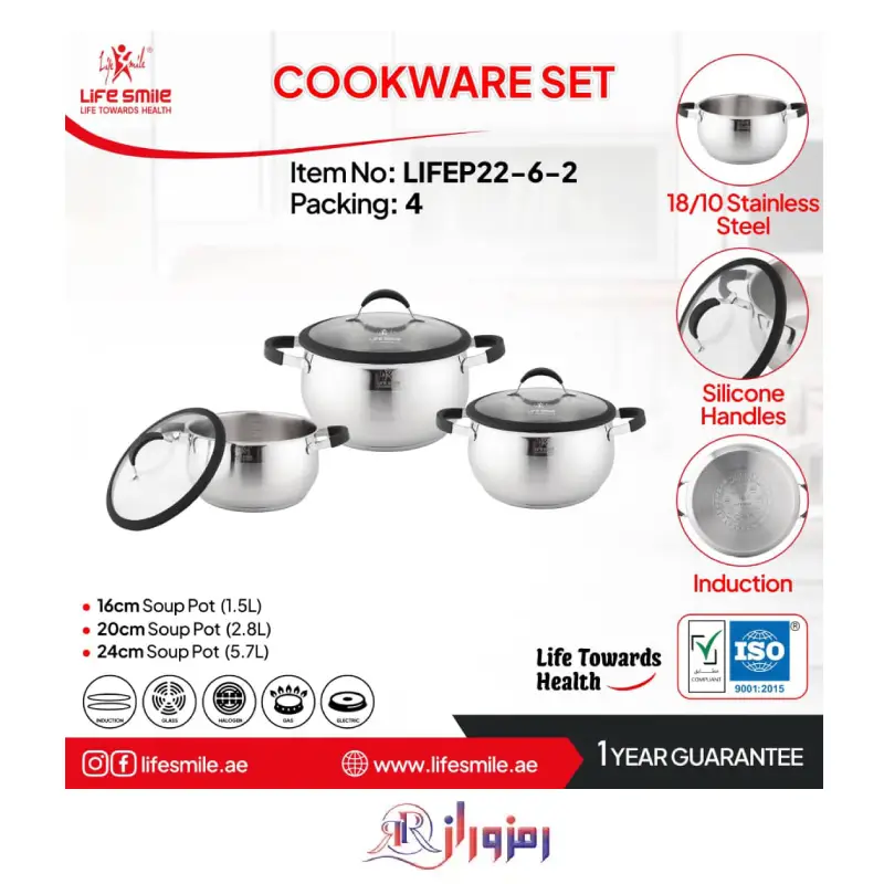 سرویس قابلمه لایف اسمایل LIFEP22-6-2 یک سرویس قابلمه استیل با کیفیت از برند لایف اسمایل است.این سرویس قابلمه 6 پارچه استیل لایف اسمایل دارای 3 قابلمه در سایز های16، 20، 24 با ظرفیت 1.5 لیتر 2.8 لیتر و 5.7 لیتر می باشد و می توانید به راحتی برای مهمانی ها غذایی چندین نفر را در آنها آماده کنید.این سرویس ماهیتابه ندارد و تنها شامل 3 قابلمه می باشد.سرویس قابلمه 6 پارچه لایف اسمایل LIFEP22-6-2 دارای دسته های سیلیکونی است که به دلیل طراحی ارگونومیک بسیار خوش دست هستند.این سرویس قابلمه استیل لایف اسمایل دارای درب های شیشه ای با حاشیه سیلیکونی است.این دربها شفاف هستند و به شما امکان خواهند داد به راحتی محتوای داخل قابلمه ها را مشاهده کنید.این سرویس قابلمه دارای پایه القایی می باشد که سبب شده گرما به صورت یکنواخت پخش شود.فقط نکته ای که در مورد سرویس قابلمه های استیل هست این است که برای پخت غذاها از شعله خیلی زیاد استفاده نکنید به خصوص غذاهای که ابکی نیستند. این سرویس قابلمه 6 پارچه لایف اسمایل LIFEP22 تقریباً با انواع اجاق گازها سازگار است.ویژگی دیگری که این سرویس قابلمه استیل لایف اسمایل دارد این است که در ساخت آن از هیچ مواد مضری استفاده نشده است،بنابراین هیچ زیانی ندارد و می توان با خیال راحت انواع غذاهای درون آن اماده کنید.