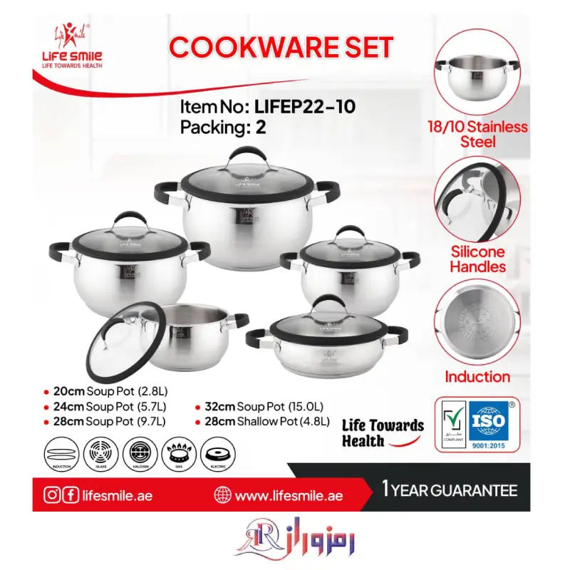 سرویس قابلمه لایف اسمایل LIFEP22-10 یک سرویس قابلمه استیل با کیفیت از برند لایف اسمایل است.این سرویس قابلمه 10 پارچه استیل لایف اسمایل دارای 4 قابلمه در سایز های 20،24،28 و 32 با ظرفیت 2.8 لیتر،5.7 لیتر،9.7 لیتر و 15 لیتر می باشد و می توانید به راحتی برای مهمانی ها غذایی چندین نفر را در آن آماده کنید.همچنین دارای ماهیتابه ای دو دسته با سایز 28 و ظرفیت 4.8 لیتر است که می توانید هم برای سرخ کردن و هم برای پخت مواد غذایی از آن استفاده کنید.سرویس قابلمه 10 پارچه لایف اسمایل LIFEP22-10 دارای دسته هاس سیلیکونی است که به دلیل طراحی ارگونومیک بسیار خوش دست هستند.این سرویس قابلمه استیل لایف اسمایل دارای درب های شیشه ای با حاشیه سیلیکونی است.این دربها شفاف هستند و به شما امکان خواهند داد به راحتی محتوای داخل قابلمه ها را مشاهده کنید.این سرویس قابلمه دارای پایه القایی می باشد که سبب شده گرما به صورت یکنواخت پخش شود.فقط نکته ای که در مورد سرویس قابلمه های استیل هست این است که برای پخت غذاها از شعله خیلی زیاد استفاده نکنید به خصوص غذاهای که ابکی نیستند. این سرویس قابلمه 10 پارچه لایف اسمایل تقریباً با انواع اجاق گازها سازگار است.ویژگی دیگری که این سرویس قابلمه استیل لایف اسمایل دارد این است که در ساخت آن از هیچ مواد مضری استفاده نشده است،بنابراین هیچ زیانی ندارد و می توان با خیال راحت انواع غذاهای درون آن اماده کنید.