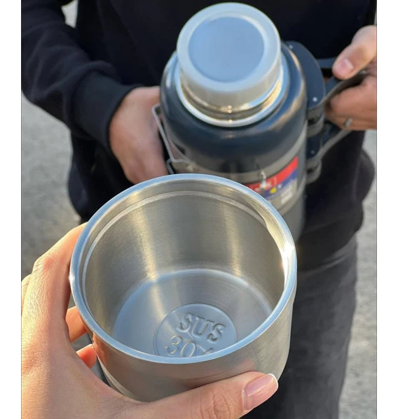 درب اول فلاسک 3 لیتری سفری به صورت پیچی طراحی شده که کاملا استیل است و به عنوان یک لیوان ودوجداره میتوان از آن استفاده نمود.