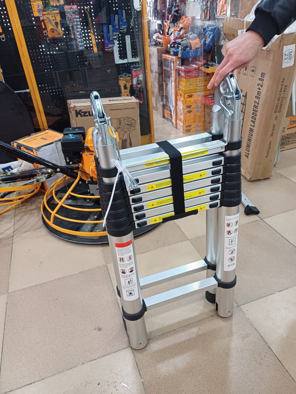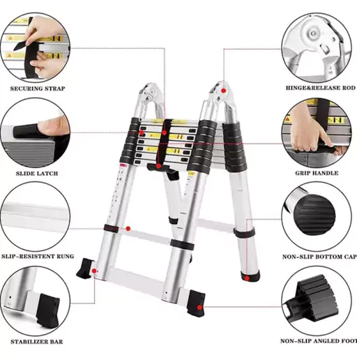 یکی از ویژگی های نردبان تلسکوپی 2 طرفه 5 متری این است که جمع می شود و خیلی کم جا می گیرد،بنابراین می توانید خیلی راحت آن را در گوشه ای از خانه قرار دهید و هر موقع که لازم بود از آن استفاده کنید.این نردبان دارای بدنه المینیومی می باشد و استحکام بسیار خوبی دارد و وزن سنگین تا 120 کیلوگرم را به راحتی تحمل می کند.