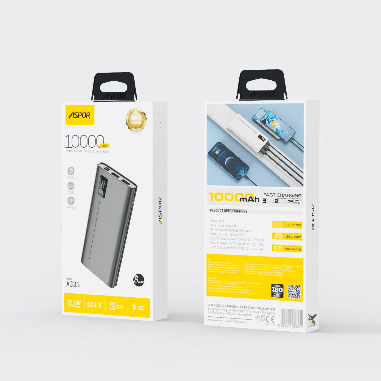 پاوربانک فست شارژ آسپور مدل A335 22.5W PD+QC 4.0 ظرفیت 10000 میلی آمپر - توان 22.5 وات